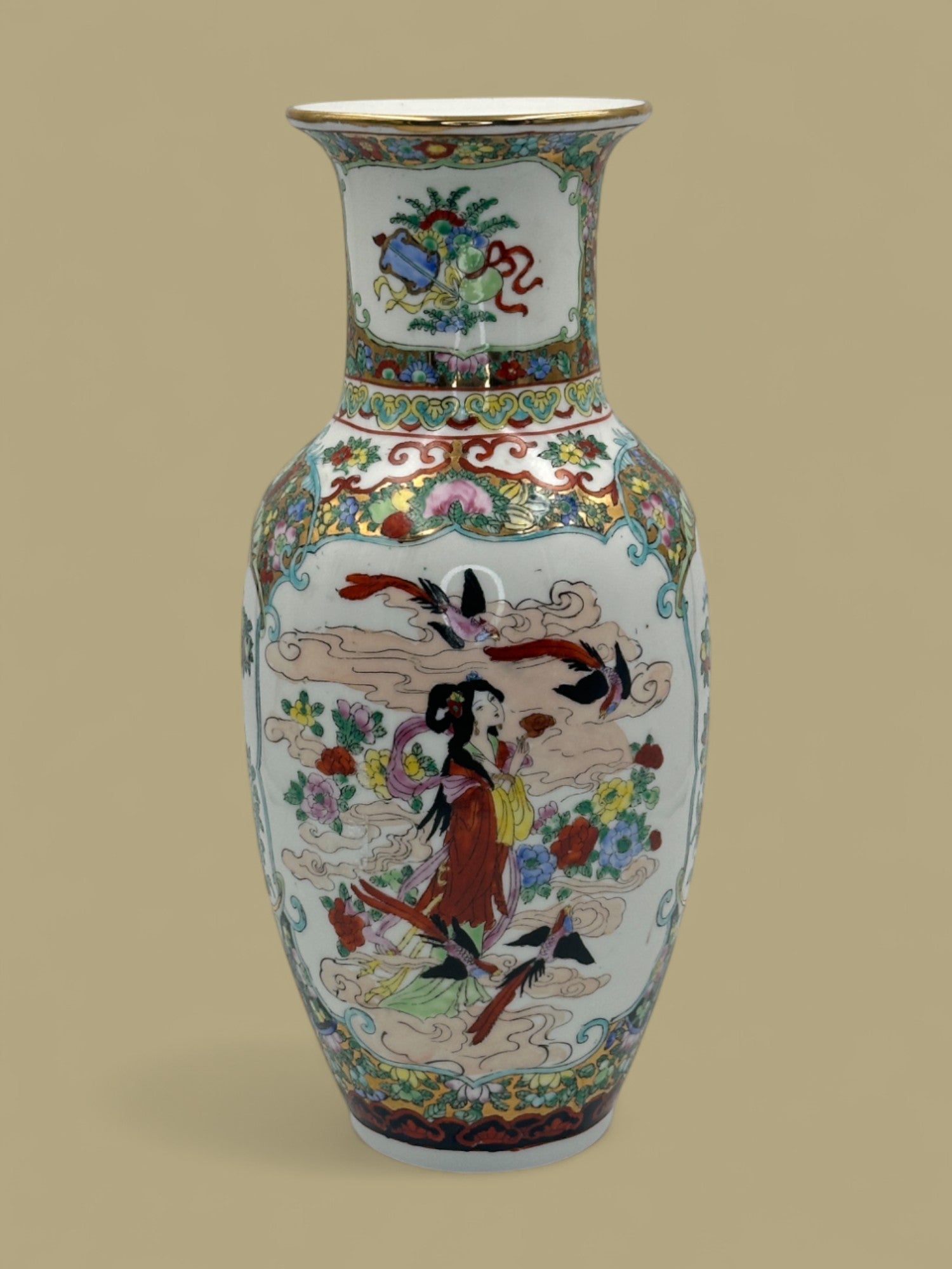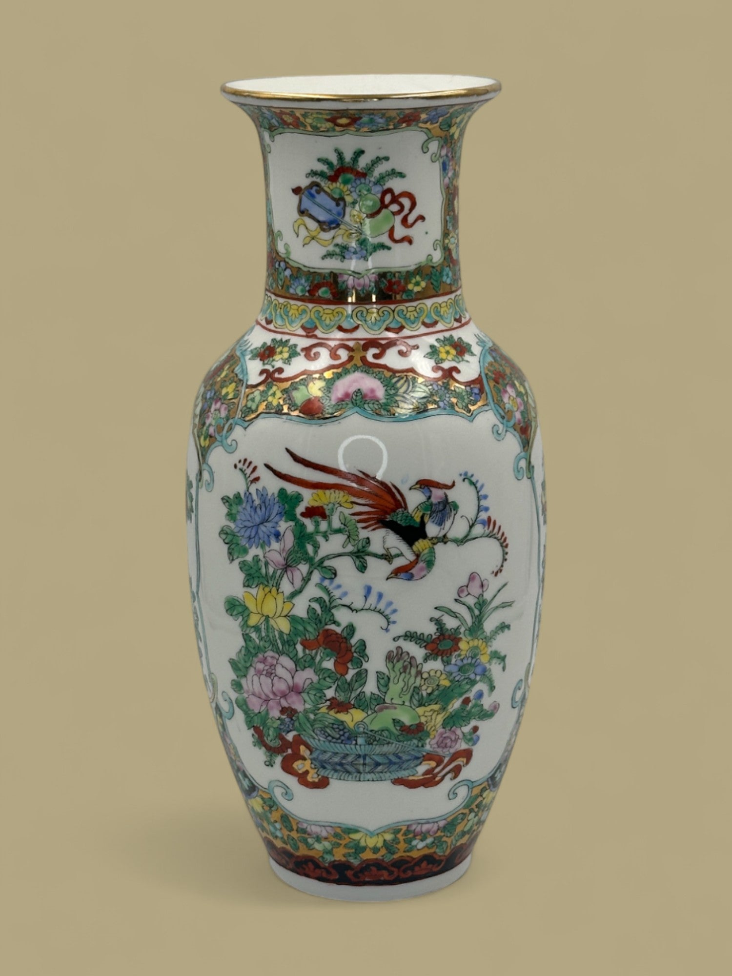 Vintage 1950-1965 Large Vintage Lotus Blooms Hand Painted Famille Rose Chinese Vase