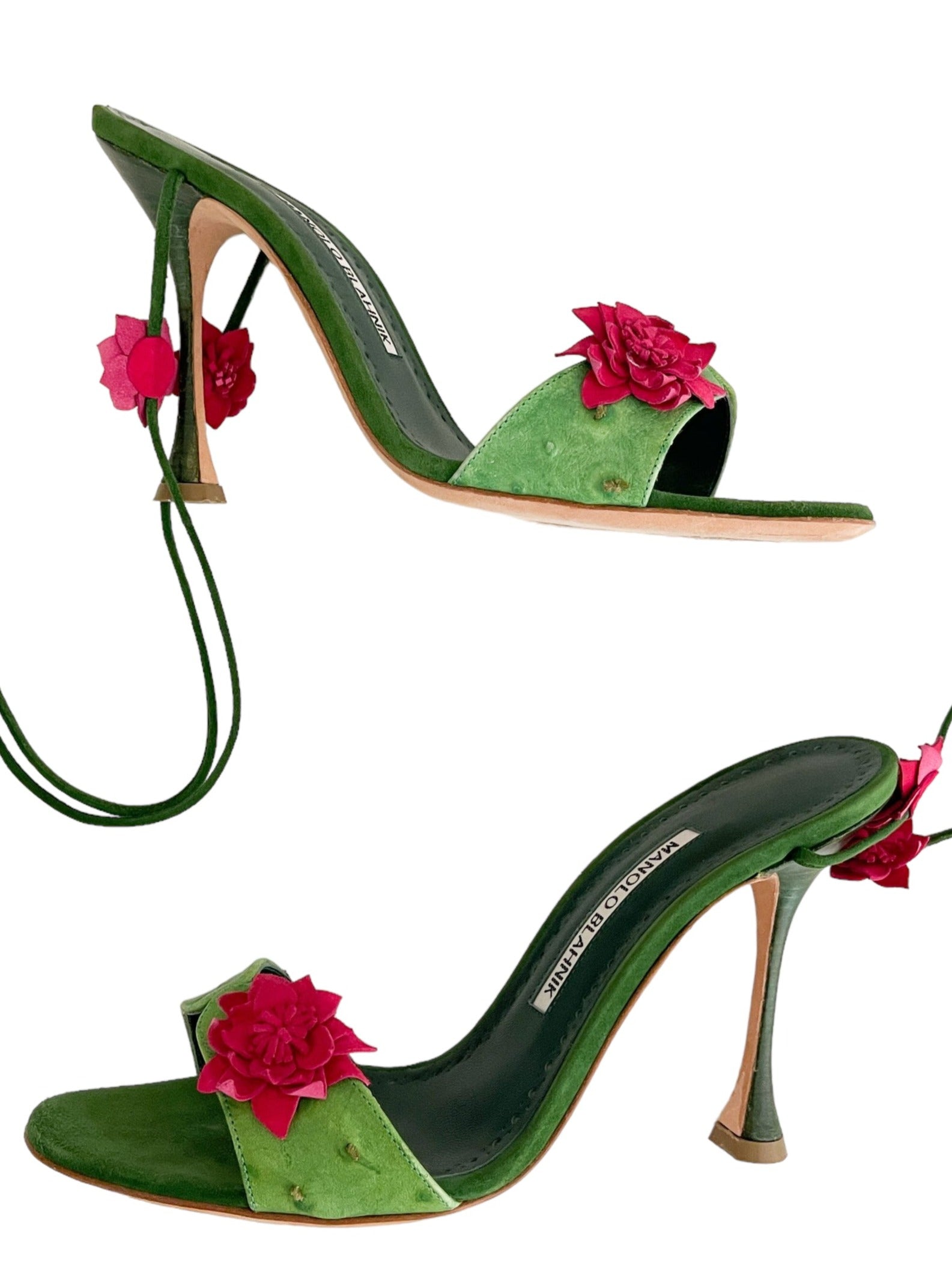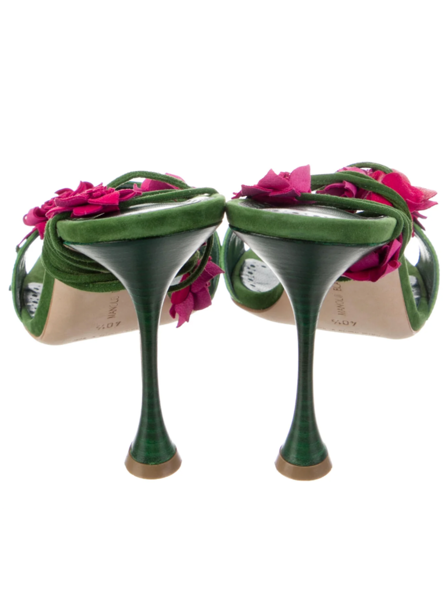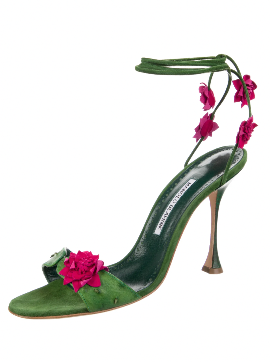*RARE* Manolo Blahnik Suede Sandals Green Floral Print Stiletto Heels Wrap-Around Straps & Lace-Up Closure at Ankles