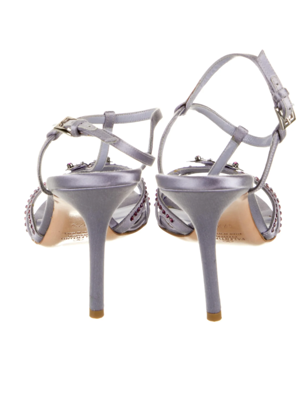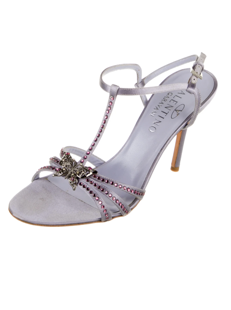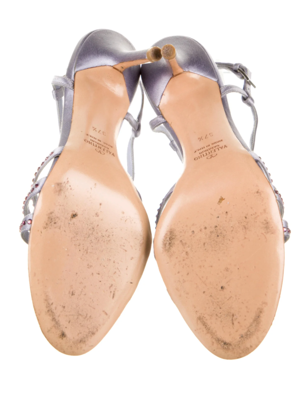 Valentino Vintage T-Strap Sandals Purple Satin Crystal Embellishments Stiletto Heels Multistrap & Buckle Closure at Sides
